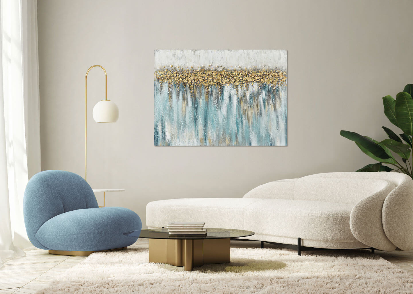 “Horizon” הוא ציור חומר מופשט בלבן, כחול וזהב, צבוע ביד על קנבס כותנה