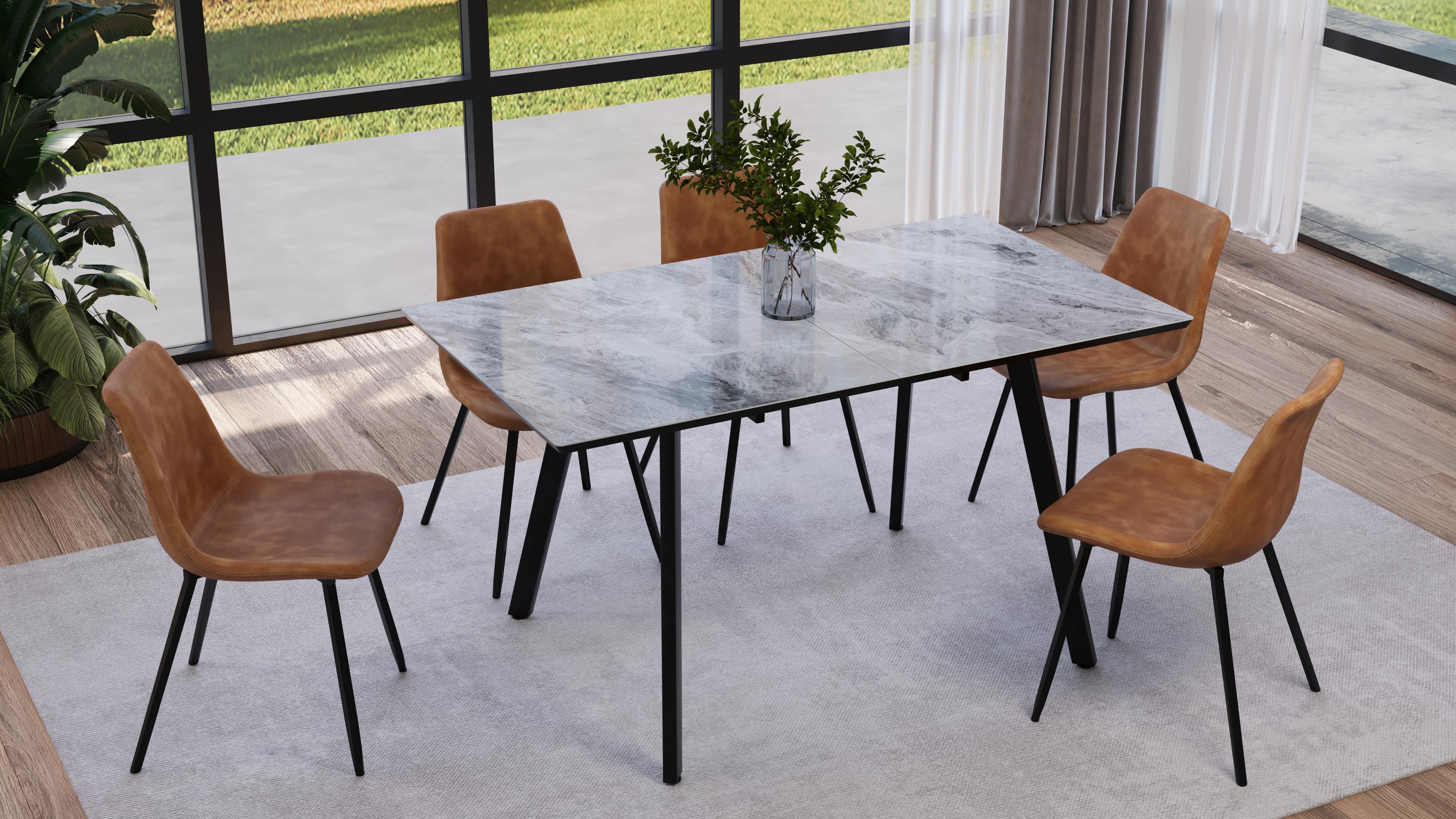 שולחן קרמיקה איכותי עם דוגמת שיש עדינה, משולב ברגלי מתכת שחורות בעיצוב מינימליסטי ויציב במיוחד. השולחן מתאים גם לחללים קטנים וגם לאירוח בזכות מנגנון פתיחה נוח שמאפשר הרחבה מיידית.