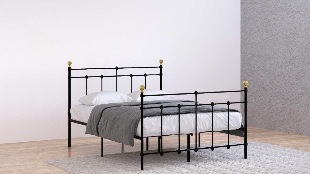מיטה זוגית בעיצוב קלאסי ונקי, עשויה מתכת חזקה ועמידה לאורך שנים. מסגרת המיטה מגיעה בצבע שחור עם קצוות מעוטרות בגוון זהב עדין, המעניקים למיטה מראה אלגנטי וייחודי שמתאים לכל חדר שינה.
