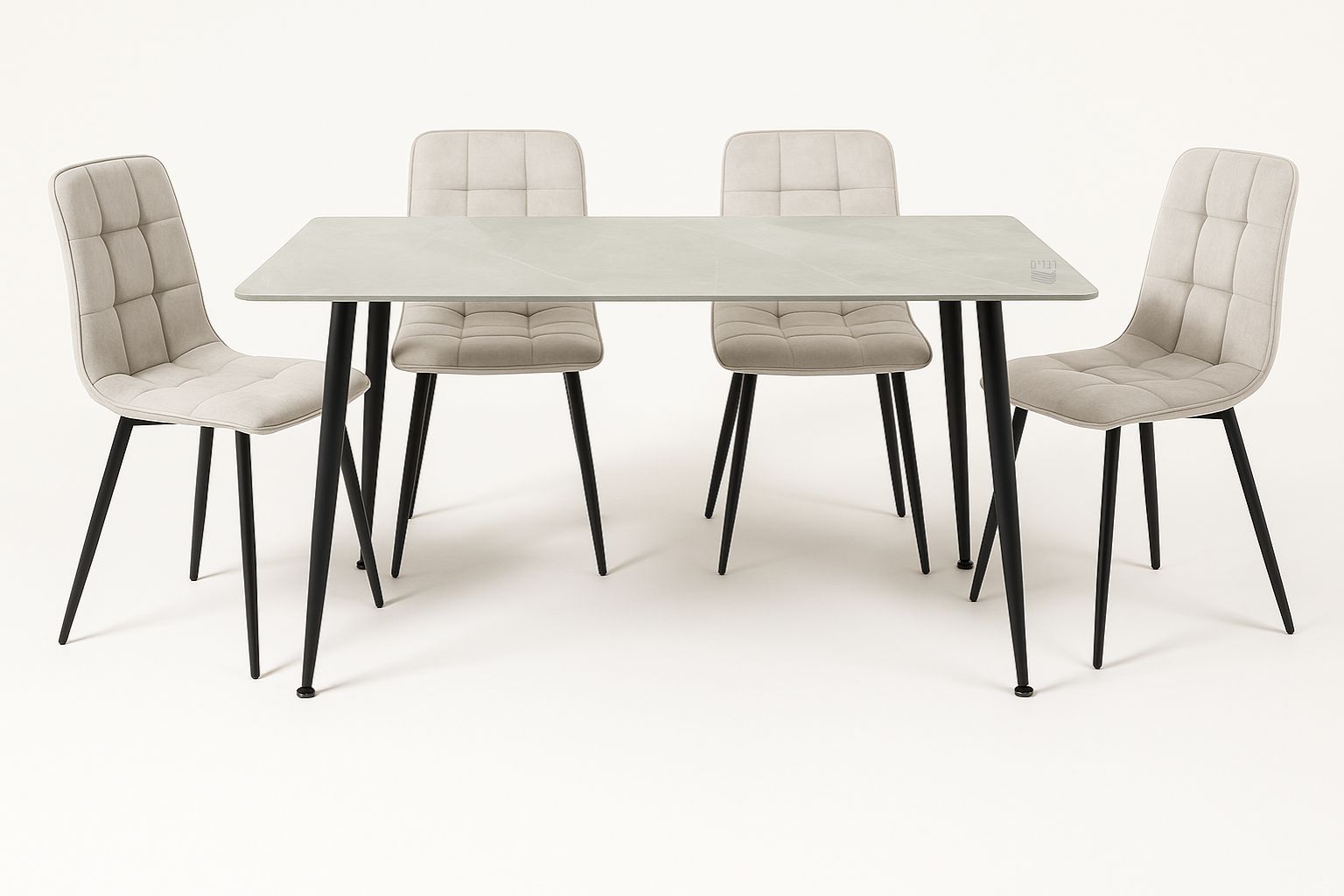 הסט כולל שולחן אוכל מעוצב בקו מודרני עם משטח אבן סינטרית איכותית בגוון אפור כהה או אפור בהיר, ו־4 כסאות דגם סינגו בעלי מושב מרופד ונוח במיוחד.